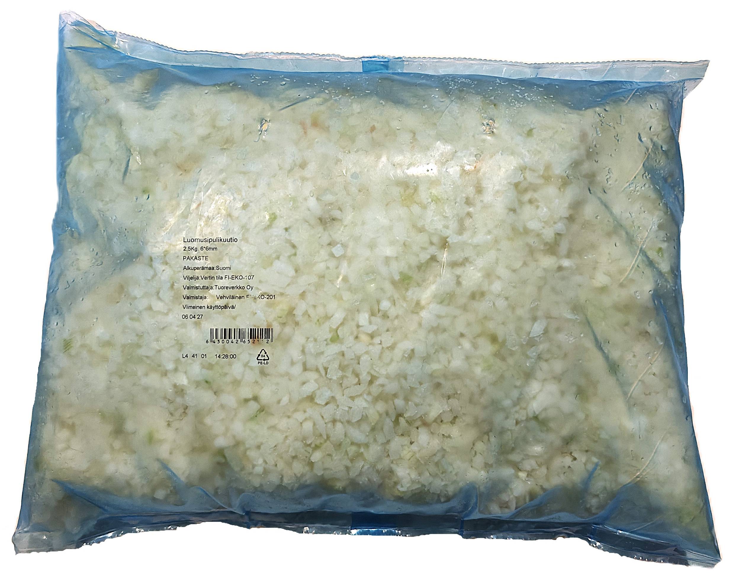 Luomupakastesipulikuutio, 100 % luomua ja kotimaisuutta. Haukivuorella, Vertin tilalla kasvatettua luomusipulia, joka on leikattu käyttövalmiiksi raakakuutioiksi. Älä tingi laadusta tai mausta, vaan lisää helposti luomun osuutta lautasella.
