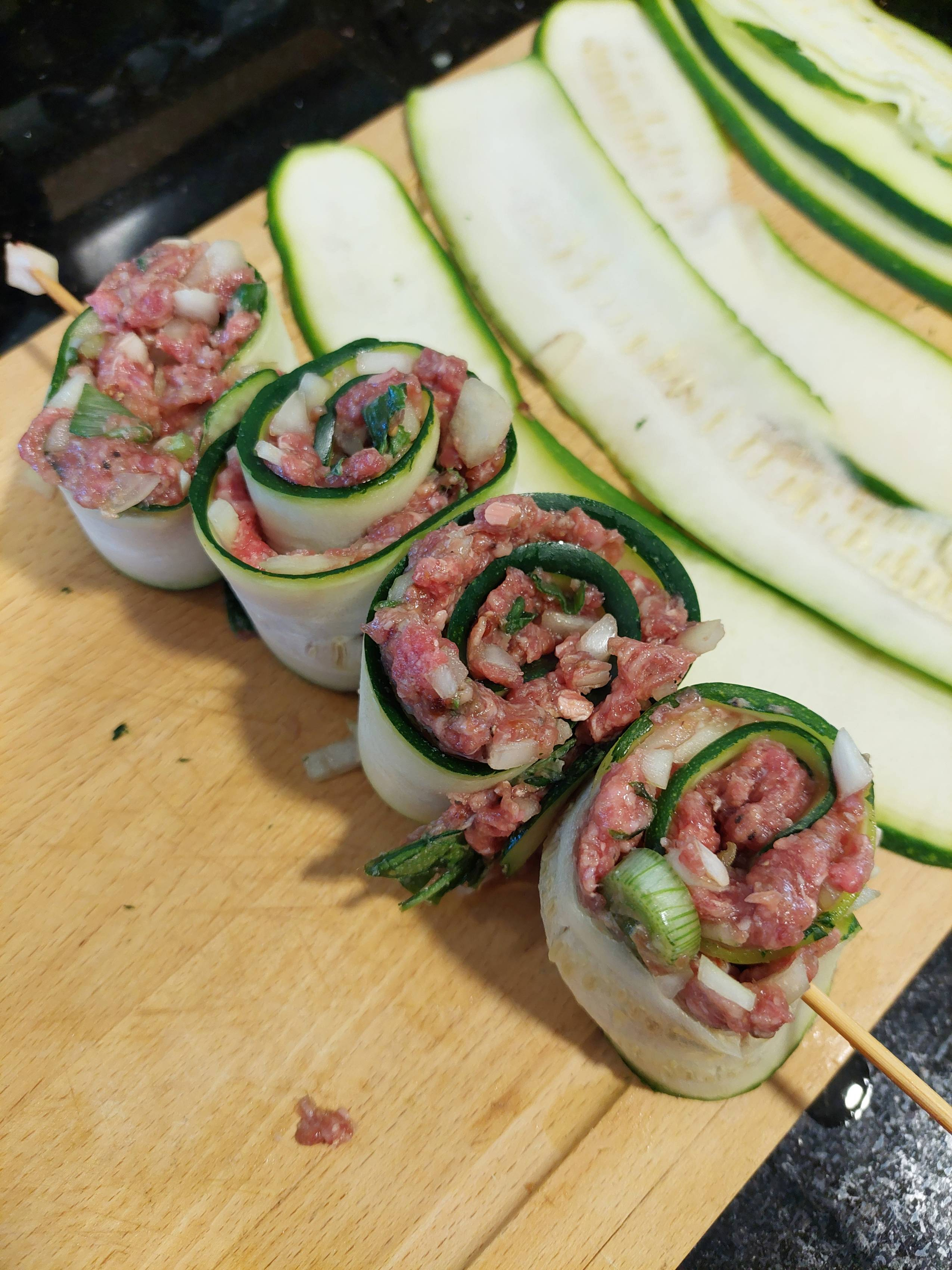 Levitä jauhelihatäyte suikaleille ja rullaa yksi kerrallaan kääryleiksi. Pujota aina kääryle varrastikkuun, ennen seuraavan rullausta, niin ne pysyvät hyvin koossa. Yhteen varrastikkuun sopii noin 5 käärylettä.