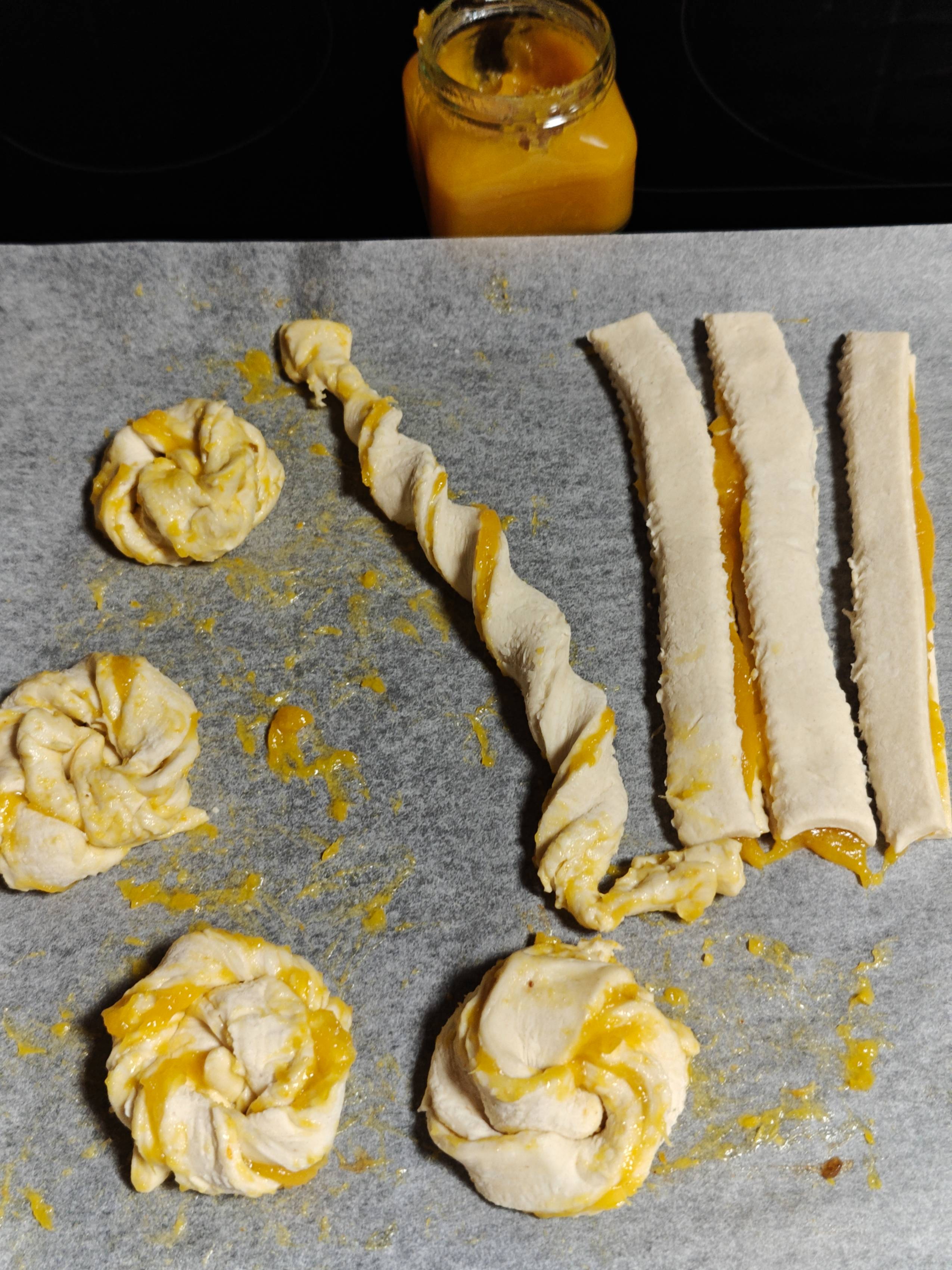 Touhu oli hieman sotkuista, joten itse otin puhtaan leivinpaperin ja pellin, jolle siirsin valmiit kierteet. Voitele joulutorttukierteet halutessasi kananmunalla ja paista 225-asteisessa uunissa noin 10-15 minuuttia.